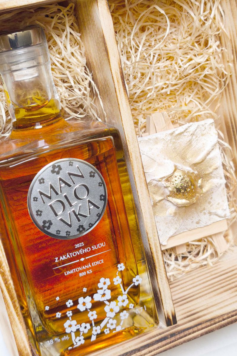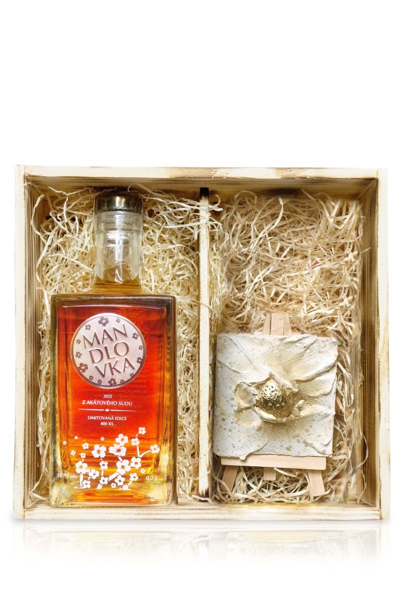 Ručně vyráběný dřevěný box ukrývá nejen luxusní lahev Mandlovky, ale také edici malého obrázku se zlatou mandlí.