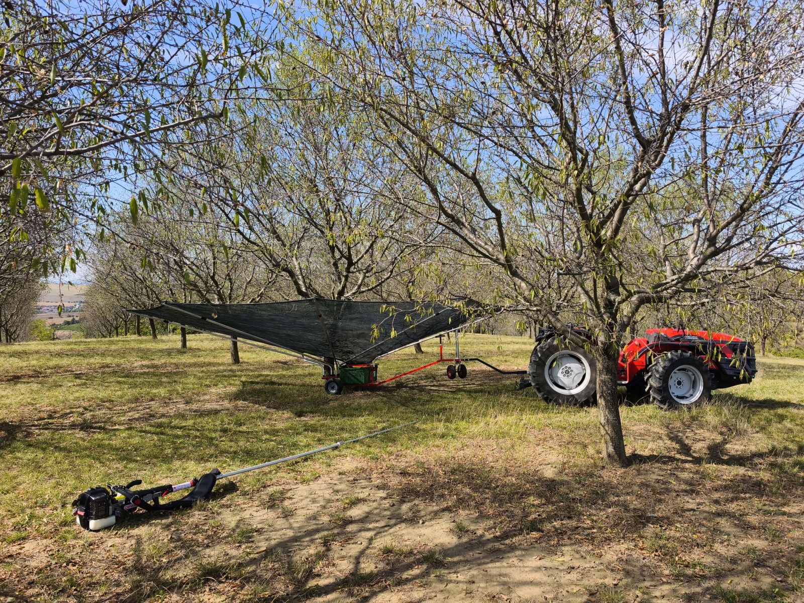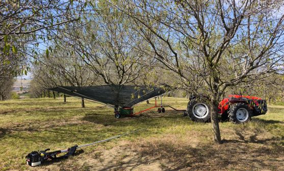Prakticky velká síť, která se doslova "zaparkuje" u mandloně a roztáhne pod celou jeho korunou. Třesením pak mandle padají na síť a kutálejí se do připravených přepravek.